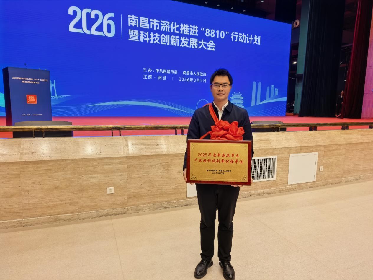 3月9日,南昌市深化推进“8810”行动计划暨科技创新发展大会召开。省委常委、南昌市委书记、赣江新区党工委书记李红军出席并讲话。会议对2025年度制造业重点产业链优强企业、科技创新优强单位等进行表扬。南昌大学国际食品创新研究院(以下简称“国创院”)凭借在服务地方经济、攻克产业关键技术及深化产教融合方面的突出贡献,被南昌市委、市政府授予“2025年度制造业重点产业链科技创新优强单位”荣誉称号。国创院常务副院长陈军受邀参加大会并代表研究院接受表彰。