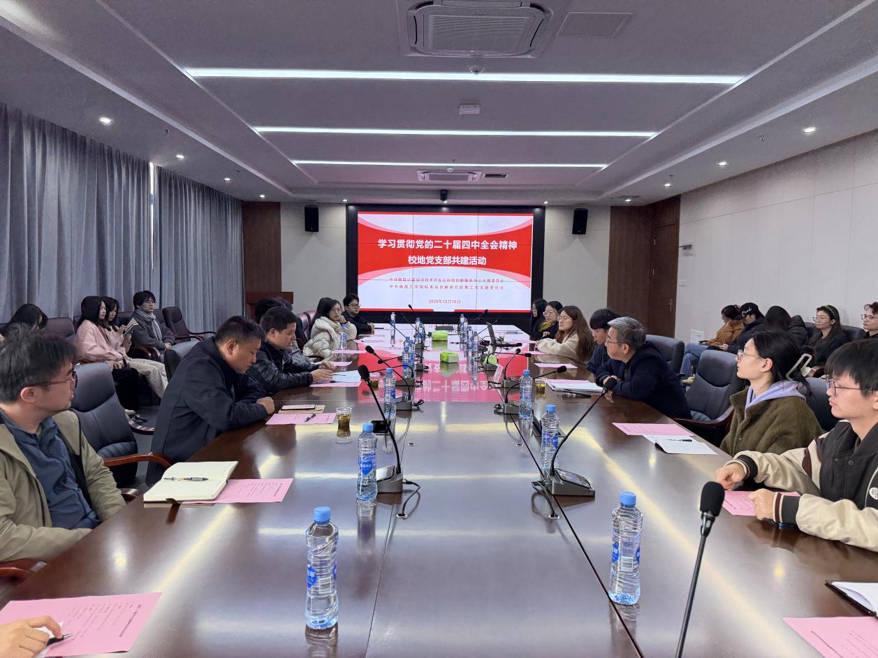 12月10日上午,研究院邀请中共南昌县委(小蓝经开区党工委)宣讲团成员、小蓝经济技术开发区科技创新服务中心主任王鹏来院,围绕学习贯彻党的二十届四中全会精神进行了专题宣讲。宣讲结束后,中共南昌小蓝经济技术开发区科技创新服务中心党支部和中共南昌大学国际食品创新研究院教工党支部还进行了联学共建活动。宣讲会由研究院副院长仲维嘉主持。